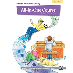 The "All-in-One Course for Children" takes all of the pages from "Alfred's Basic Piano Library," Lesson Books 1A, 1B, and 2, plus selected pages from Theory, Recital and Fun Solo Books and combines them into part of a sequential five-book series. At the completion of Book 5, the student will be ready to continue into Level 3 of "Alfred's Basic Piano Library" or "Alfred's Premier Piano Course."