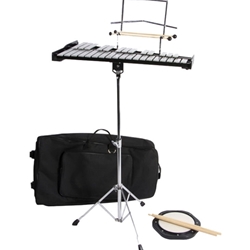 32 Note - 2 1/2 Octave Bells - (F5-C8) - unmarked Easy Set-Up stand with threaded knob assembly Stand is height adjustable from 25" to 38" Non-Slip Rubber Feet Double Sided Mallets - One standard and one for softer sound and reduced volume - ideal for student practice 8" Drum Practice Pad replicates the real drum feel and bounce but is quiet enough to be used almost anywhere Carrying case comes with backpack straps, side and top handles, and wheels for easiest transportation