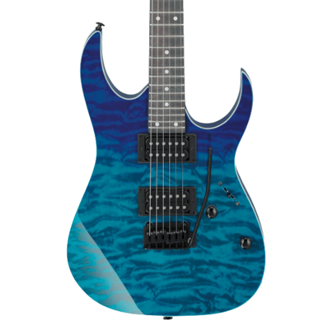 The Ibanez GIO GRG120QASP Electric Guitar delivers metal-approved tone and playability for guitarists on a budget. Part of Ibanez's GIO series, the GRG120QASP is constructed with a maple neck and purpleheart fretboard for bright tone and smooth playability. Equipped with dual Infinity R humbucker pickups, this ax pumps out tight, high-output distortion suited for heavy genres. Engage in divebombs and whammy tricks using the GRG120QASP's T102 tremolo bridge.