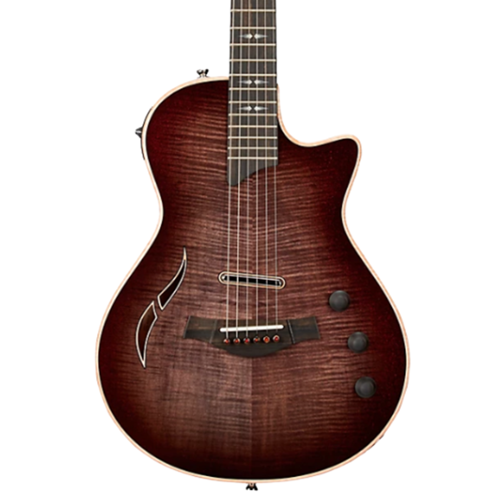 The T5z Custom Acoustic-Electric Guitar features an urban-ash body with a flamed big leaf maple top and Taylor's proprietary T5 electronics with five-way switching. Custom features include chamfered body edges, black fretboard binding, stained bone bridge pins with red Australian opal dots, nickel tuners, silver spire fretboard inlays in faux pearl and a full-body gloss with a phoenix color shift finish. This instrument ships in a Taylor Deluxe hardshell case for maximum protection.